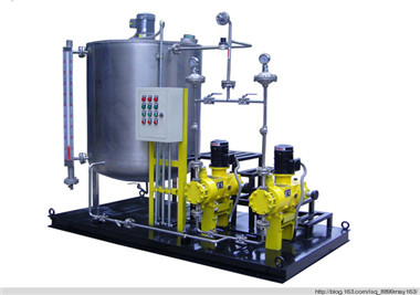 KBY型-自动加药装置是粉状高分子凝絮剂的全自动连续配置及投加系统。干粉絮剂从螺旋推进器内进入预混器与清水进行预混,被湿润的物料进入配制槽进行稀释,按要求浓度进行配制。配制过程中,配制溶液浓度不变。配制溶液从配制槽经熟化槽再今日储存槽,当储存槽液位处于高位时,配制过程自动停止,当溶液下降到中液位时,重新自动启动配料过程。配制槽和熟化槽均设置多桨叶搅拌器,充分保证絮凝剂的吸湿盒熟化。另外,可用储存槽下液位信号来控制投加过程的启停。